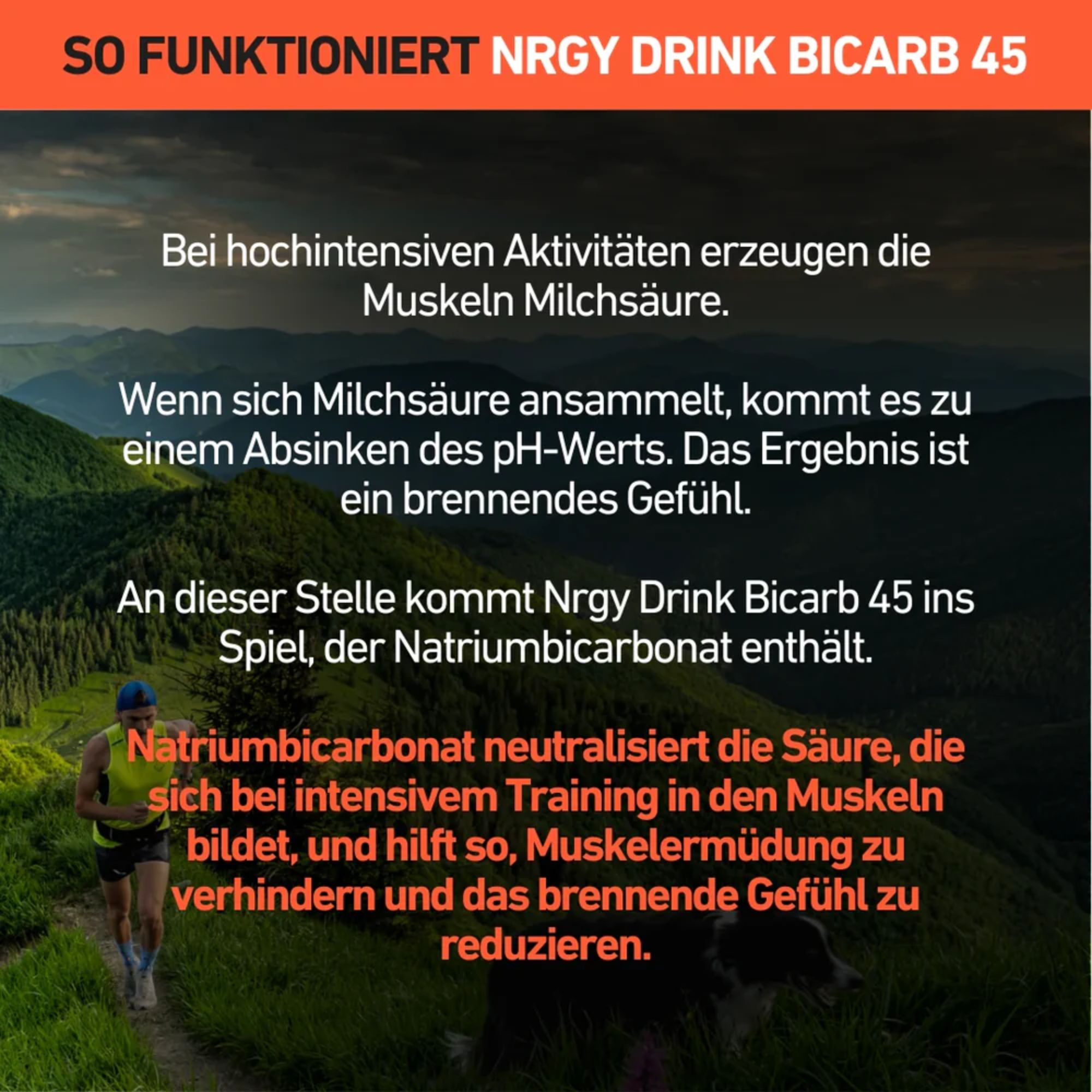 Natriumbicarbonat wird von vielen Spitzenausdauersportlern eingesetzt, um die Ausdauerleistung zu verbessern und die Muskelübersäuerung bei intensiver Belastung zu reduzieren. Nrgy Drink Bicarb 45 enthält 5 Gramm Natriumbicarbonat pro Portion. Dadurch kann ein stabiler Natriumbicarbonatspiegel unterstützt werden, was während intensiver Trainingseinheiten zu einer verbesserten Muskelfunktion beitragen kann.