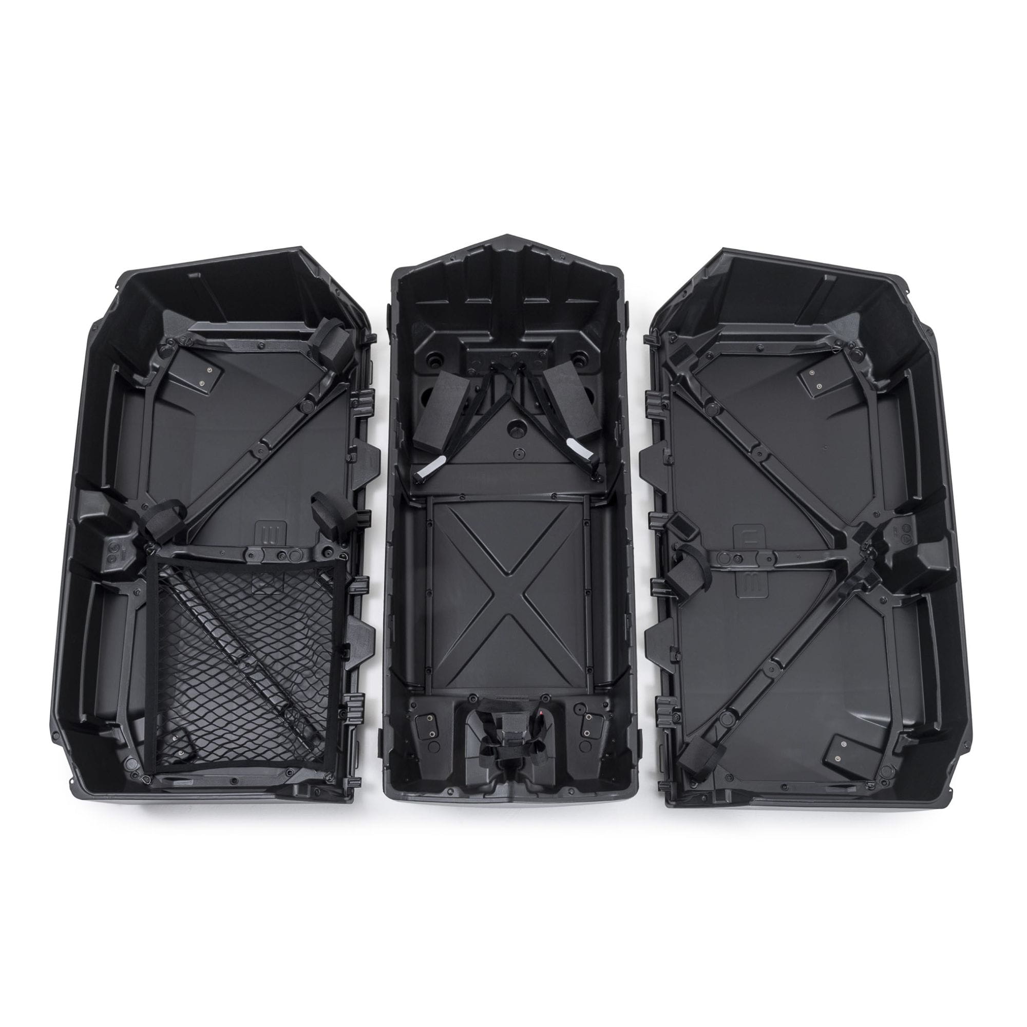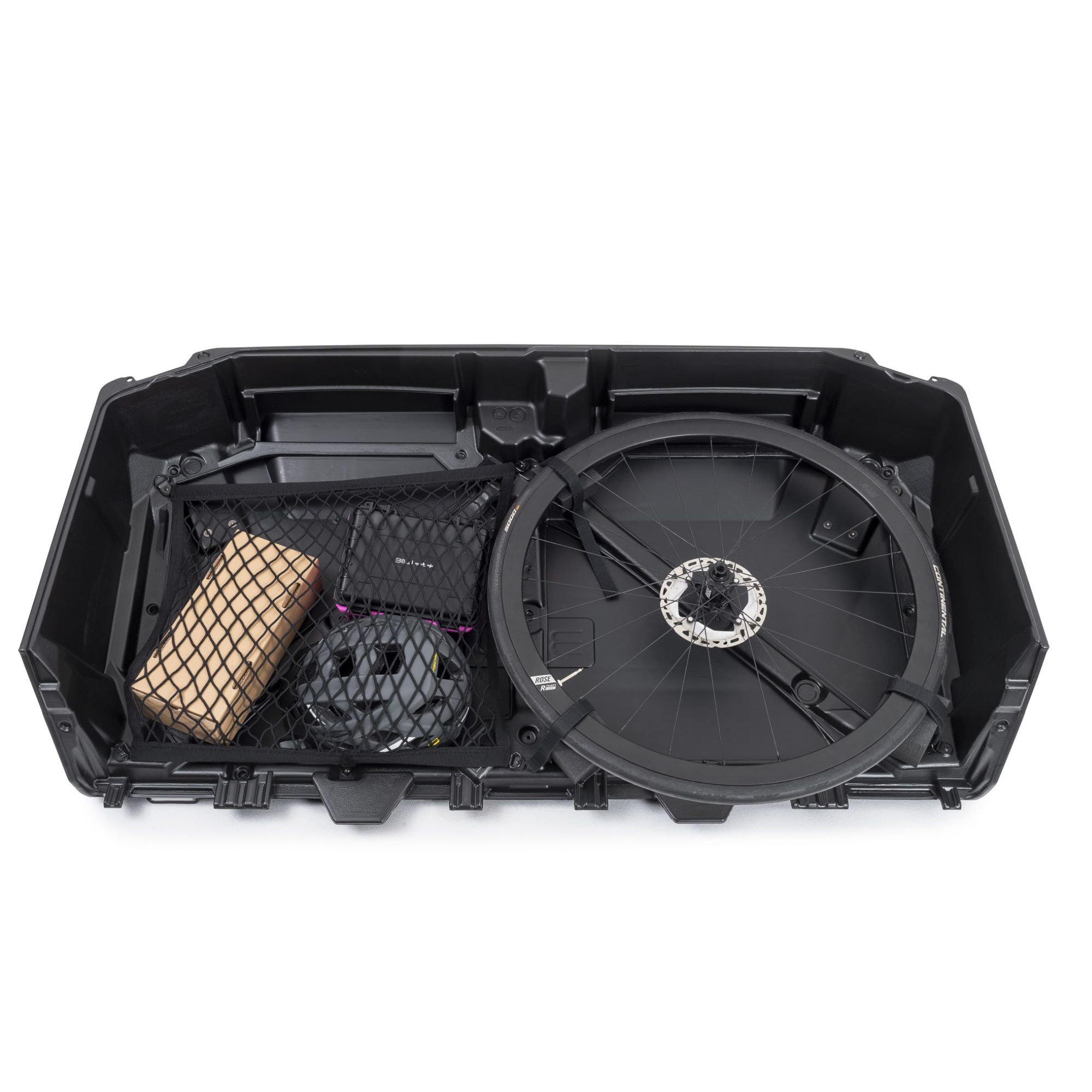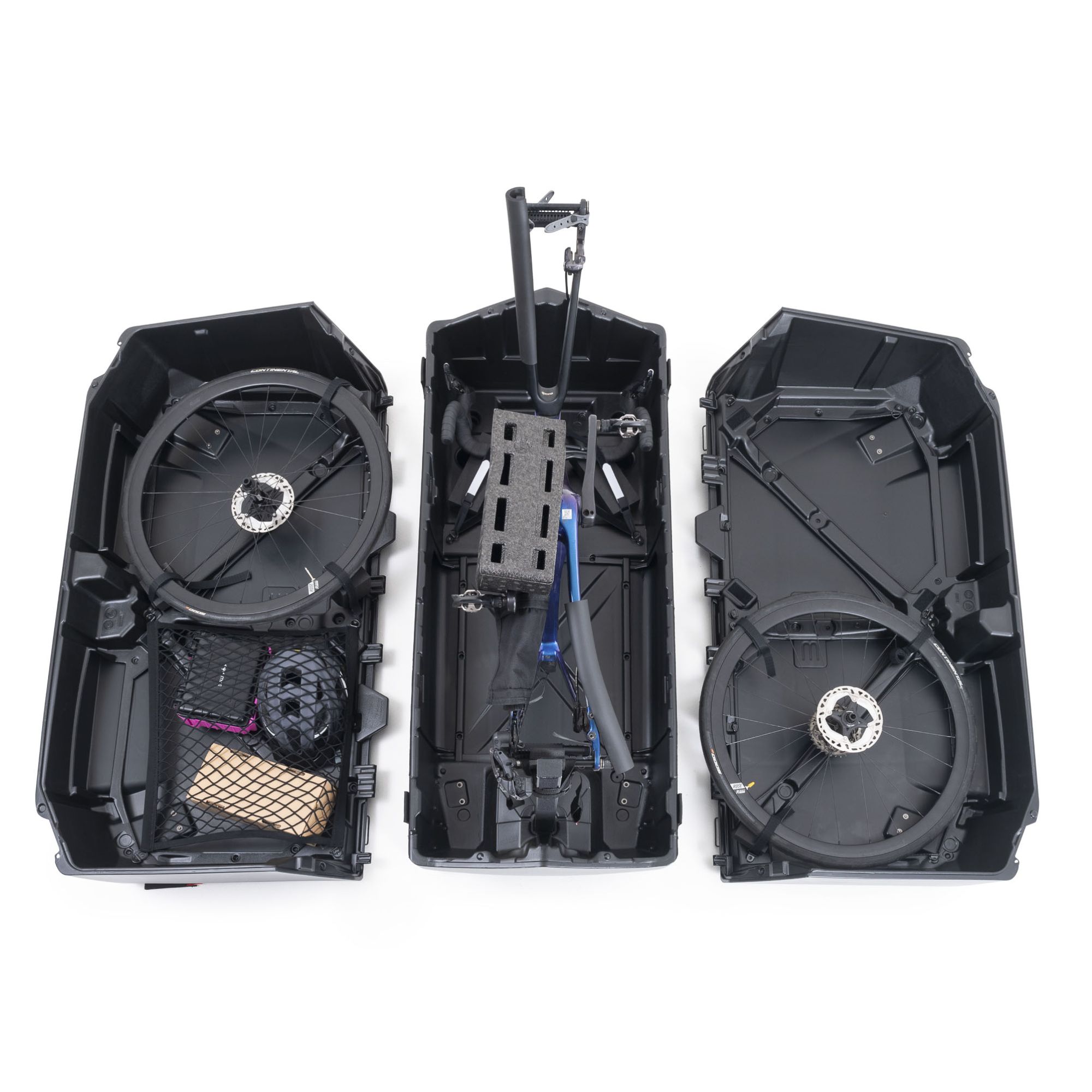Der Koffer besteht aus zwei Seitenschalen für Laufräder, Helm und Zubehör, sowie einer zentralen Hauptschale für den Rahmen. Im Inneren sorgt das integrierte bike.shield-System für eine stabile Fixierung deines Fahrrads. Gepolsterte Elemente schützen empfindliche Bereiche wie Rahmen, Gabel und Schaltwerk. Laufräder können separat verstaut werden, sodass sie optimal gesichert sind. Das clevere Befestigungskonzept minimiert Bewegungen während des Transports und erhöht so die Sicherheit deines Equipments deutlich.