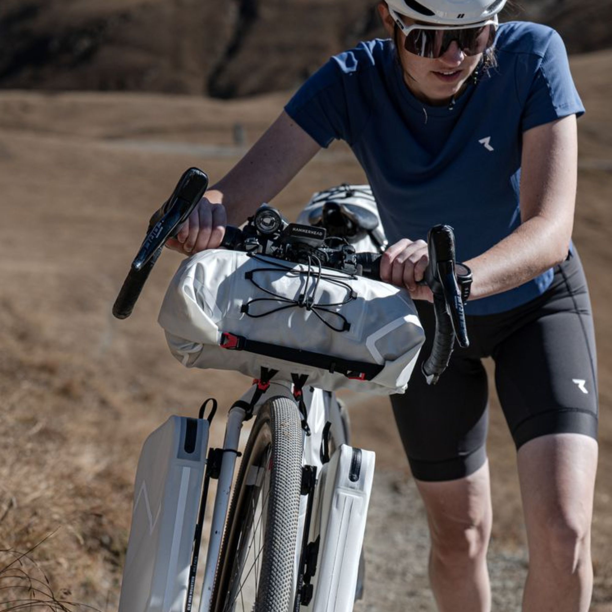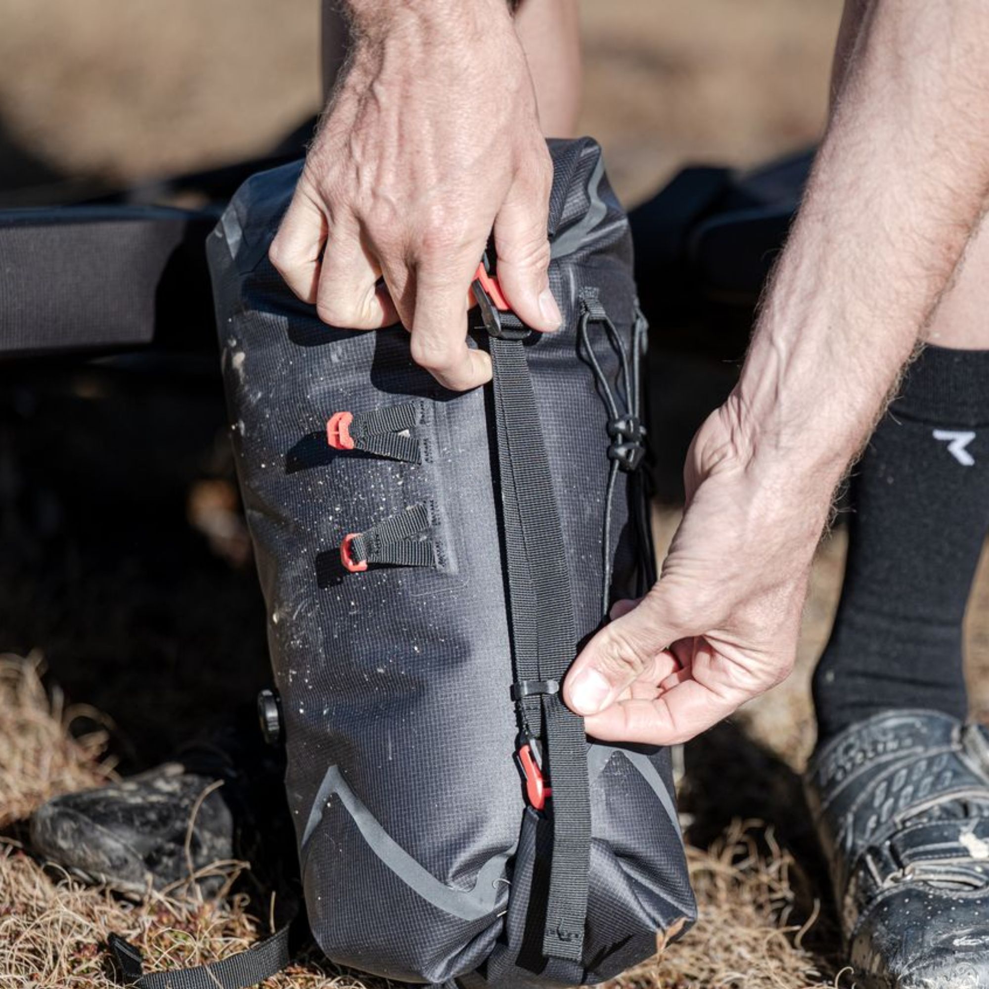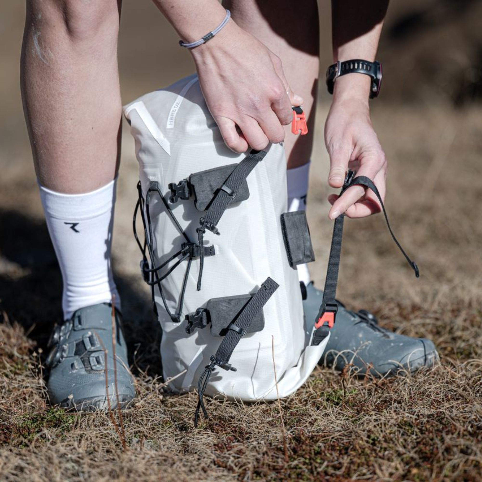 Durch das gezielte Komprimieren der Tasche reduzierst du ihr Volumen an den Seiten. Das schafft zusätzlichen Freiraum am Unterlenker, besonders bei Rennrad- oder Gravel-Lenkern mit Drop Bars. Dadurch kannst du bequem greifen, sicher bremsen und dein Bike jederzeit kontrolliert steuern – auch wenn deine Bikepacking-Ausrüstung am Lenker befestigt ist.