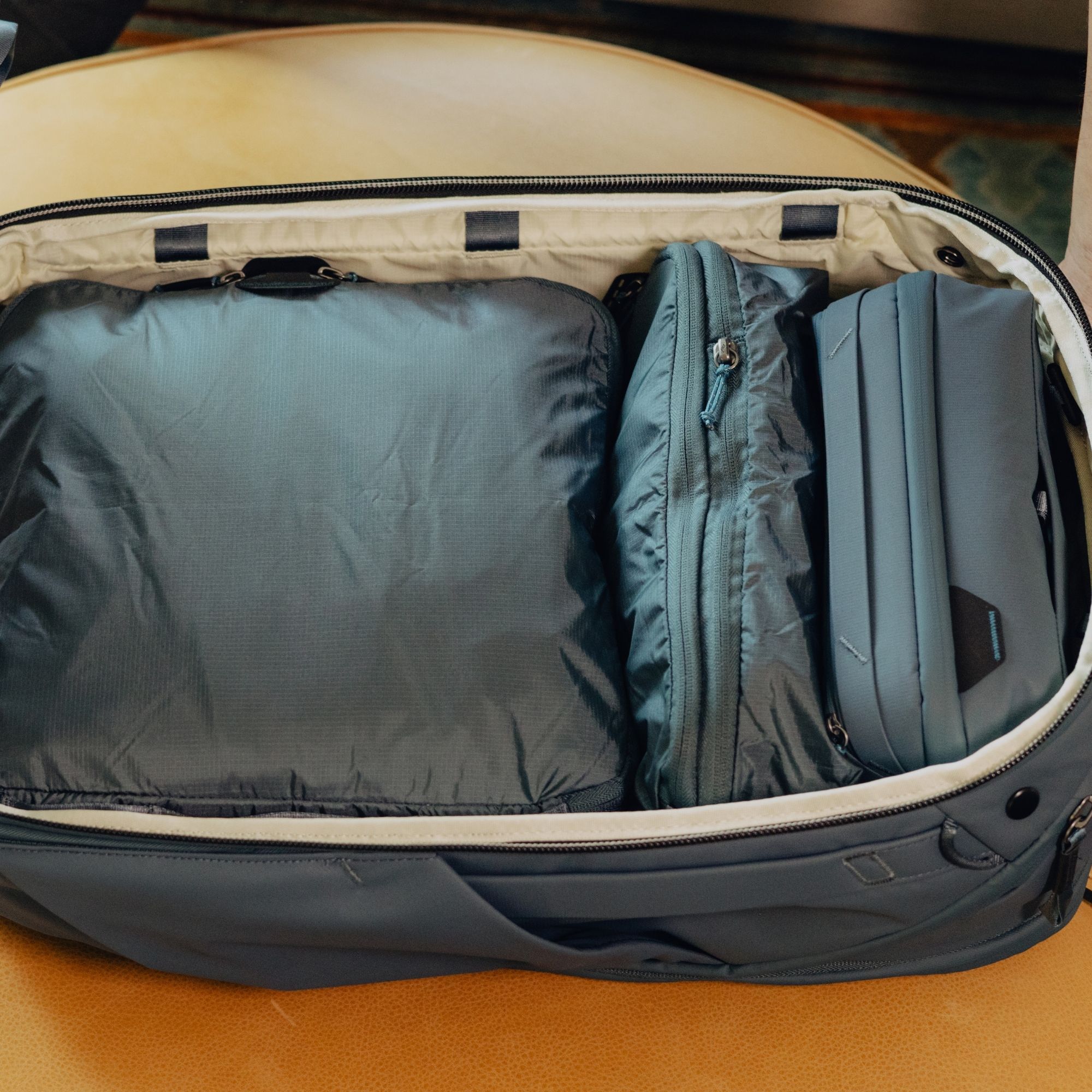 Je ein kleiner Packwürfel aus dem Travel-Line-System zählt als eine Moduleinheit, von denen sich insgesamt drei im Rucksack verstauen lassen. Ein Bespiel: Der kleine Camera Cube zählt als eine Moduleinheit, während ein voll bepackter Packing Cube Medium mit zwei Moduleinheiten zu Buche schlägt. Du kannst also einen Camera Cube und einen Packing Cube Medium verstauen. Und beim 45 Liter Backpack bleibt zusätzlich noch Platz für eine Tech Pouch oder eine Wash Pouch.