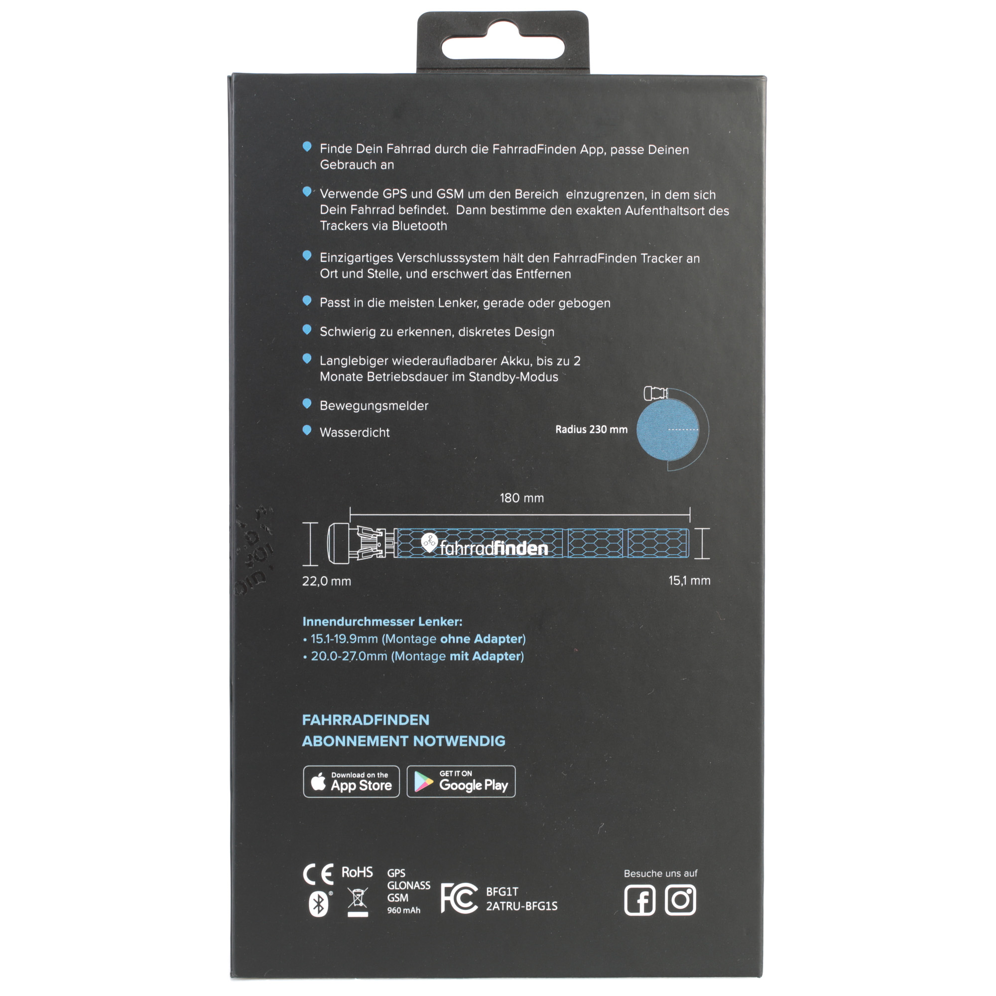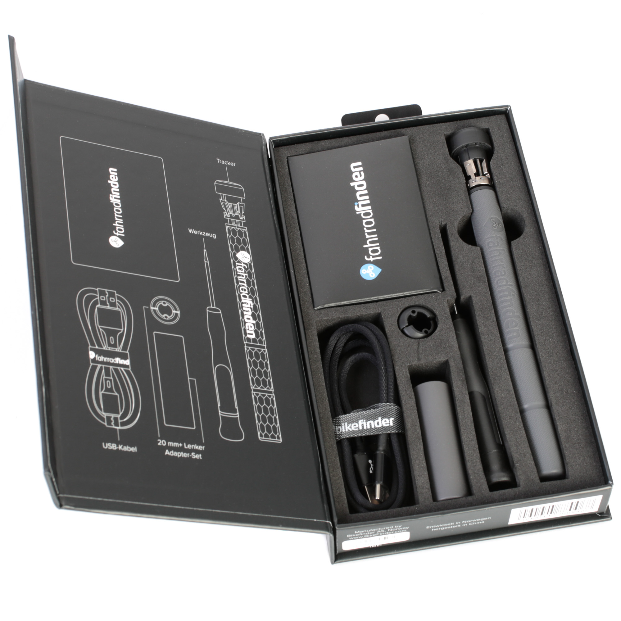 Achtung: Für die Nutzung des Trackers wird ein Abo des Herstellers benötigt. Die Abo-Optionen sind hier einsehbar und werden direkt auf der Seite des Herstellers gebucht. Um den Tracker im Lenker zu installieren befolge die beiliegende Anleitung.